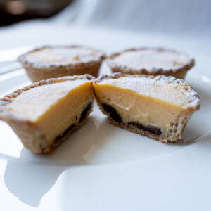 全粒粉を加えた素朴な味わいのパイ生地に、卵の風味豊かなカスタードクリームをたっぷりと詰め、焼き上げました。底にはカカオバリー社のチョコレートを敷き込み、全体の味わいを引き締めています。やさしいコクの余韻が広がり、また味わいたくなる一品です。