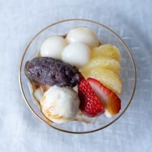 天草をじっくりと煮出して作った寒天は、風味が格別に良く、ふんわりと磯の香りが広がります。自家製あんこは、北海道産の無農薬小豆を使用し、甘さ控えめで香り高く仕上げています。コクがありながらも後味はすっきりとした、自家製バニラアイス。甘酸っぱい苺と柑橘、もちもちとした白玉団子、深みのある甘みの黒蜜を合わせました。春を感じていただける、今回限定のスペシャルスイーツです。温かい三年番茶とともにお楽しみください。